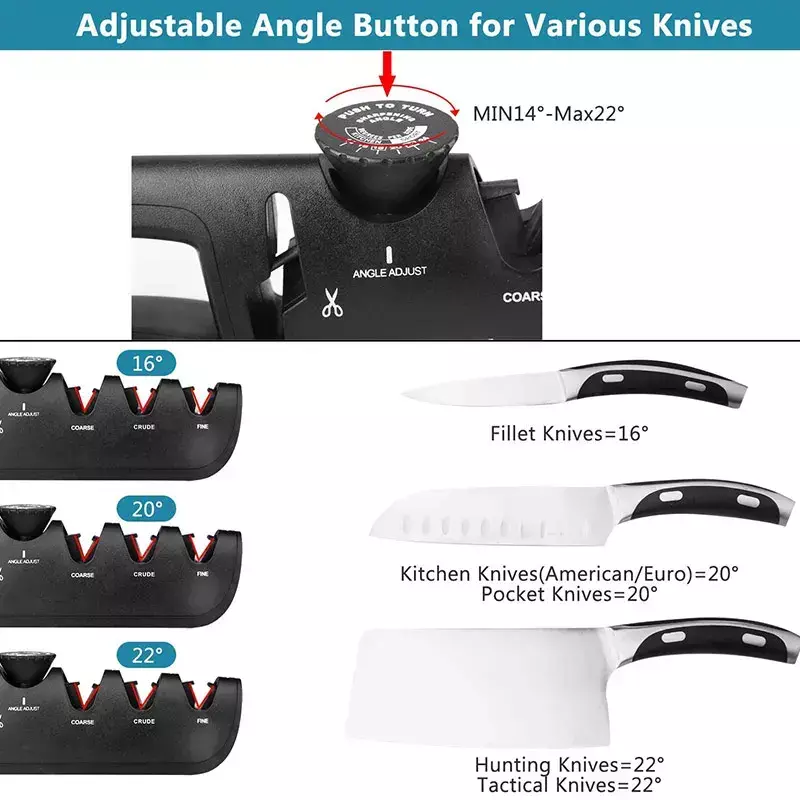 Botão de ajuste de ângulo de 14 a 24 graus, para que você possa definir o ângulo correto da lâmina para afiar facas de diferentes tamanhos, espessuras e bordas para sua borda adequada.