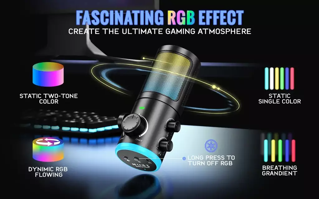 O AM6 possui 4 modos de iluminação RGB personalizados, mais de 10 cores podem ser escolhidas.Com o botão na parte inferior você pode selecionar sua cor preferida, para que seu canal se destaque entre a multidão.Da mesma forma, ligue/desligue os efeitos de luz quando você não estiver jogando.